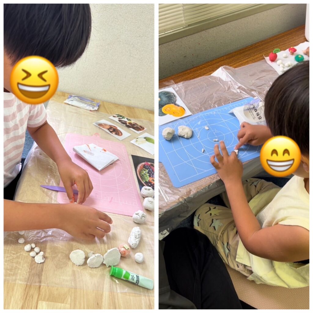 写真や絵本を参考にしながらそれぞれが作りたい秋の食べ物を選び、粘土で形を作っていきます。