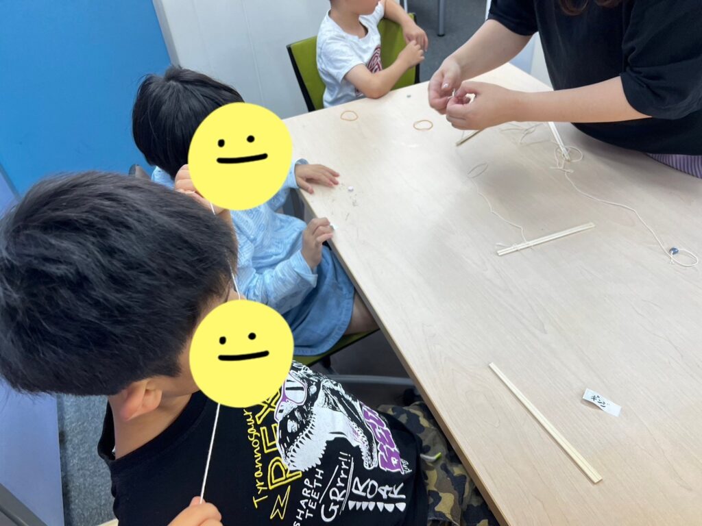 来所した子どもたちから順に、”釣り竿”を作ります。作り方が分からなかったら、補助係のお兄さんに助けてもらいましょう!