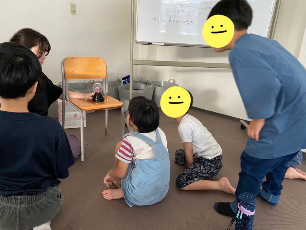 最後に、「プラズマボール」の実験です。ガラス球の中は密閉されており、実は空気とは違い、ネオンというガスが入っています。空気中では見えない、電気が走る様子が見えるという実験器具です。一生懸命説明しますが・・・難しいよね!私も説明難しかったです😊(笑)(とりあえず、「プラズマボール」だけ覚えて帰ってね!と言うと、何人かは帰りの車内でも覚えてくれていたようです♡)