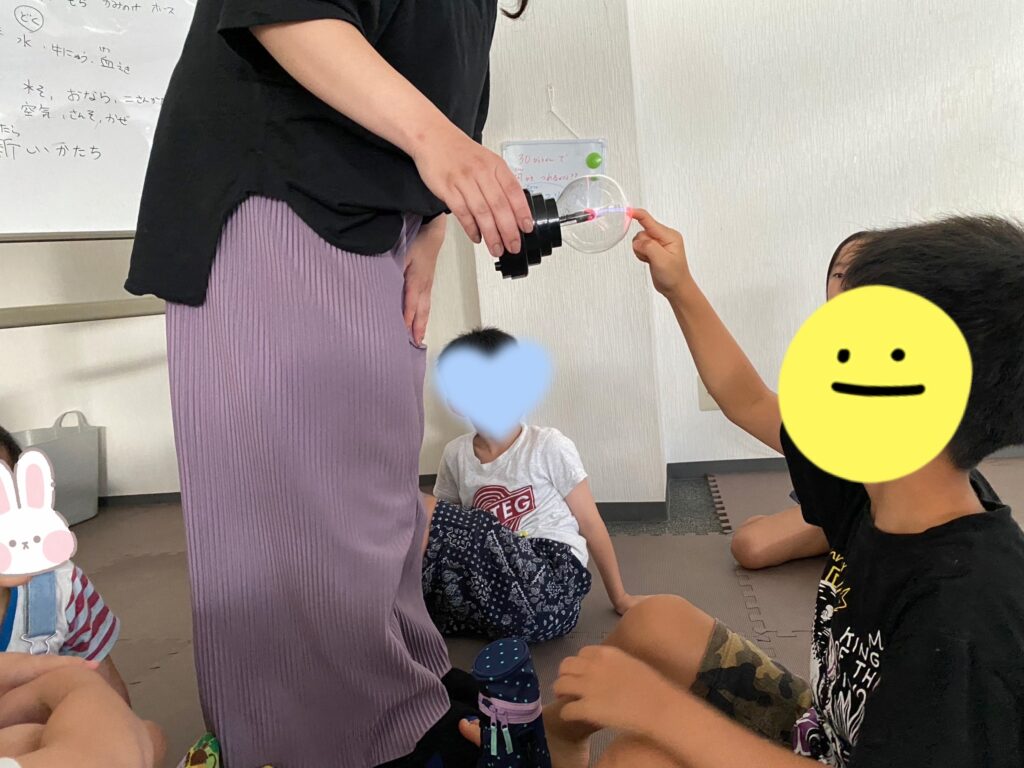 触ったり、自分でスイッチを入れてみたり・・・最初は恐る恐るだった子どもたちでしたが、指にくっつく電気を見て、「キレイ~」と感動していました。