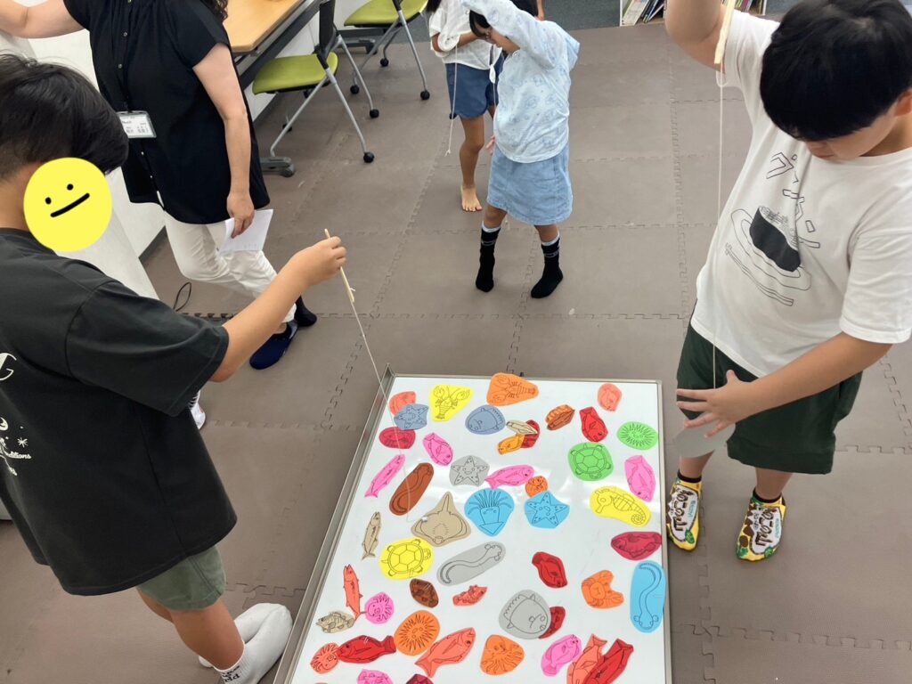 魚釣り糸の先に磁石がくっついているのですが、台も金属のため中々狙うことが難しいのです。「もう一回やる!」「悔しい~!」色々な声が聞こえてきます。